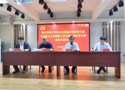 5月18日下午,机关党委组织统战党支部与马克思主义学院师生党支部结对共建启动仪式在滨湖校区特教楼南配201室举行。校党委常委、组织部长、统战部长、机关党委书记马伟,学院党总支书记马元斌以及三个党支部全体党员参加签约仪式。仪式由马伟主持。