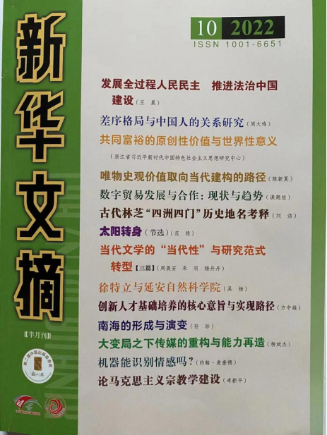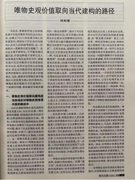 日前,《新华文摘》2022年第10期“哲学”栏目全文转载学院名誉院长陈新夏教授的文章《唯物史观价值取向当代建构的路径》。封面文章署名单位为淮北师范大学马克思主义学院。